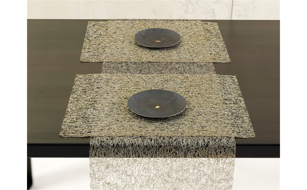 At first glance Metallic Lace appears to be real metal, however upon closer inspection it is clearly a very sophisticated and refined textile. The open abstract netting is 'metalized' to form the metallic looking surface and thus becomes a truly contemporary lace in both Placemats and runners.