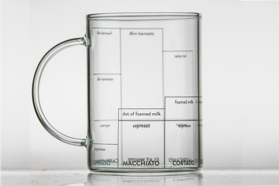 This borosilicate glass mug invites coffee drinkers to learn and create various recipes. Measure ingredients and change the proportions of espresso, milk and water using the handy indicators printed on the outside of the mug. Recipes include espresso, macchiato, cortado, caffé au lait, Americano, flat white and cappuccino. Hand wash only.