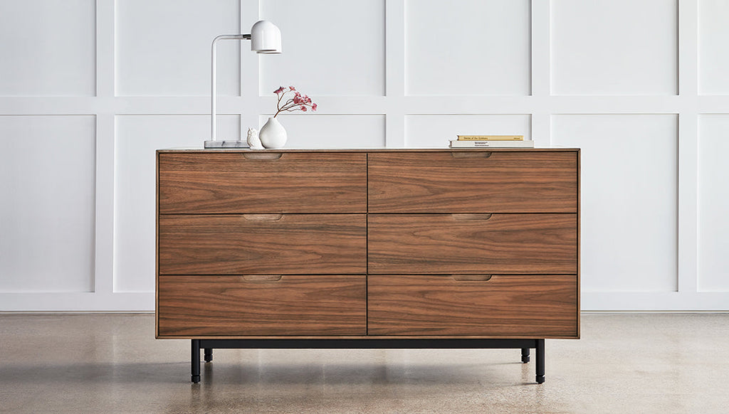 Soft close drawers feature recessed finger pulls and solid wood detailing on top edge.