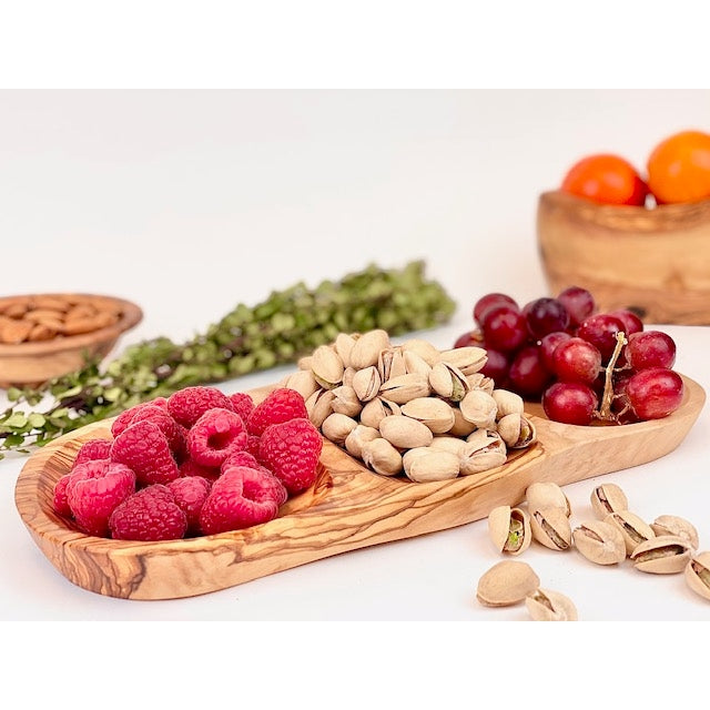 The Three Section Tray is perfect for serving olives, snacks, dips much more. The tray can also be used for decoration or to hold jewelry, keys, etc. Olive wood is a hard wood making it very dense and durable for everyday use. Olive wood is nonporous, so no germs or odors are retained. All products are made from a single piece of wood- they are seamless, and no two pieces are alike.