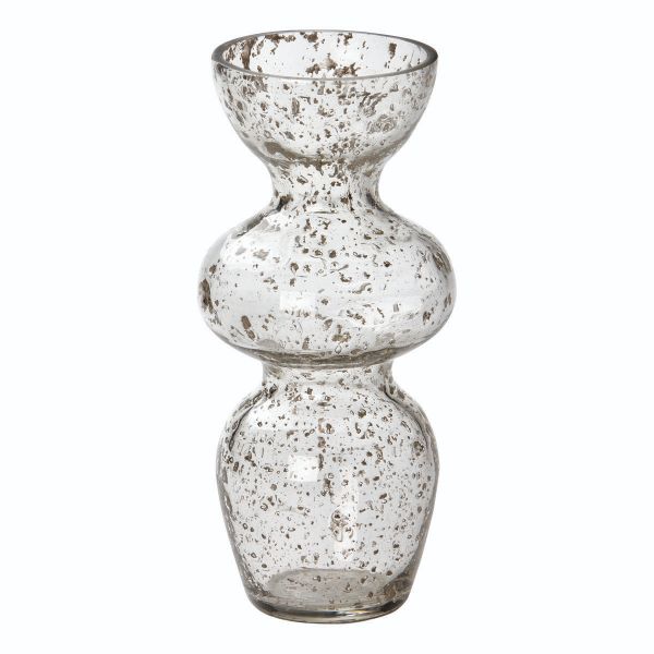 Light plays off the irregular pieces molten into the glass, offering a unique look to any decor.