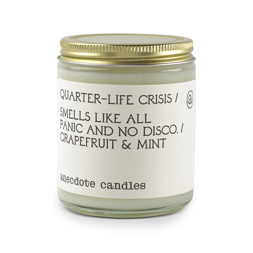 Grapefruit & Mint - Hectic yet energizing. Light yet complex. Refreshing yet sharp. Quarter-life Crisis is all of these things and more. A bold fusion of grapefruit and mint floats above a rich heart of lavender, bergamot, and rhubarb. The result is an aroma that is as invigorating as it is relaxing.