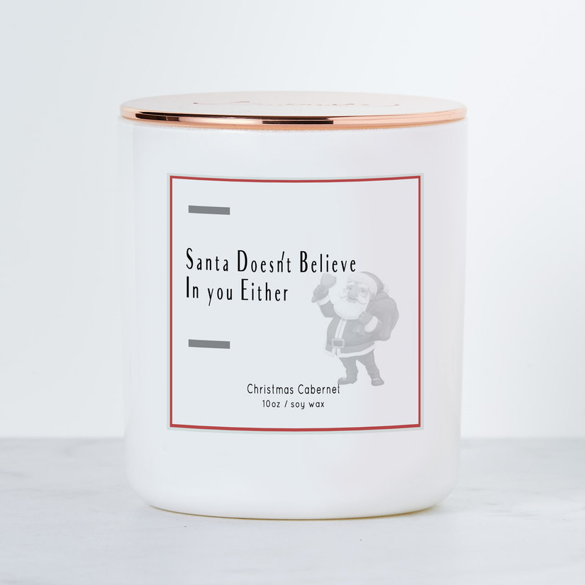 Santa Doesn't Believe in You Either - Holiday Scented Soy Candle - Christmas Cabernet. Brighten up your home this Holiday Season with laughter and our Luxe Holiday Scented candles! - White wax. - 3 x 3.5 Inches. - 10oz soy blend wax. - Luxury Glass White Gloss Vessel. - Rose Gold Cap - Hand poured in NJ.