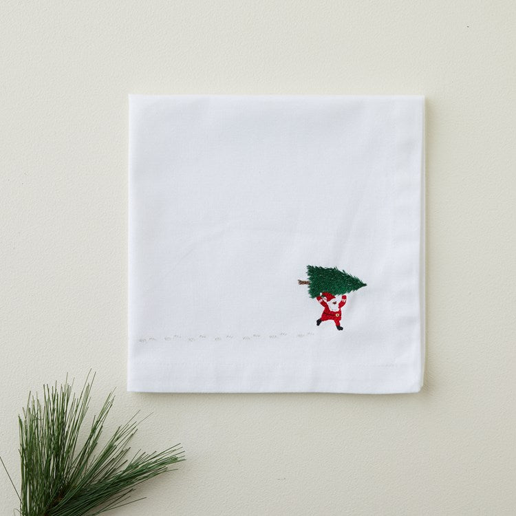 The Running Santa Napkin is a playful addition to Tableau's Holly Holidays collection, made from 100% high-quality cotton and featuring Tableau exclusive artwork; a delightfully embroidered Santa Claus runs across a snowy white background carrying a Christmas tree, leaving little grey footprints! It will add a touch of holiday joy to your home!