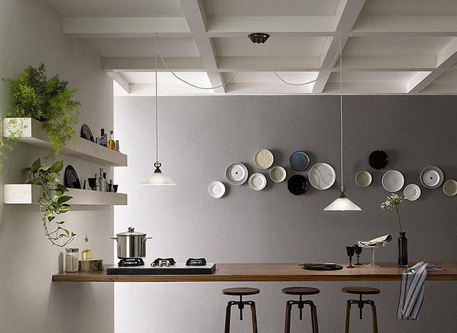 The lamps in the Tabià collection express a contemporary classic style. Made of glass with an antique brass fixture, they offer a modern interpretation of two characteristic materials of the Italian tradition. The collection, consisting of pendant lamps, ceiling lamps and wall lamps, features the search for simplicity and minimalism.
