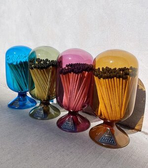 We discovered this vessel shape in Japan and while we weren’t certain what it was for, we knew it was perfect for us. The original was tiny and clear so we made it large enough to hold our best-selling 4" matches and updated it in this sophisticated color palette. Each piece is hand blown and fitted with a cork stopper in the bottom. It reminds us of a vintage glass cloche, originally used to protect emerging seedlings in gardens. Once the matches are gone, it can be a curiosity used to display a found specimen.